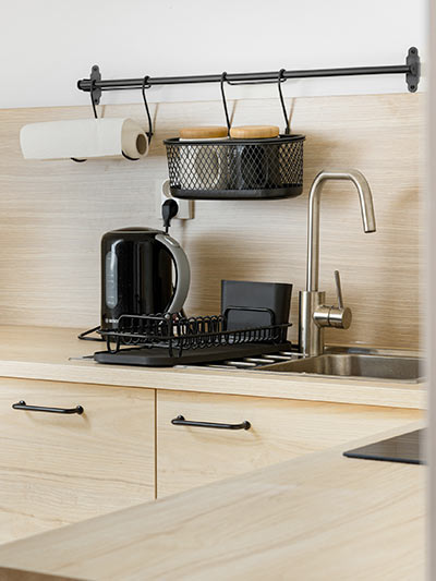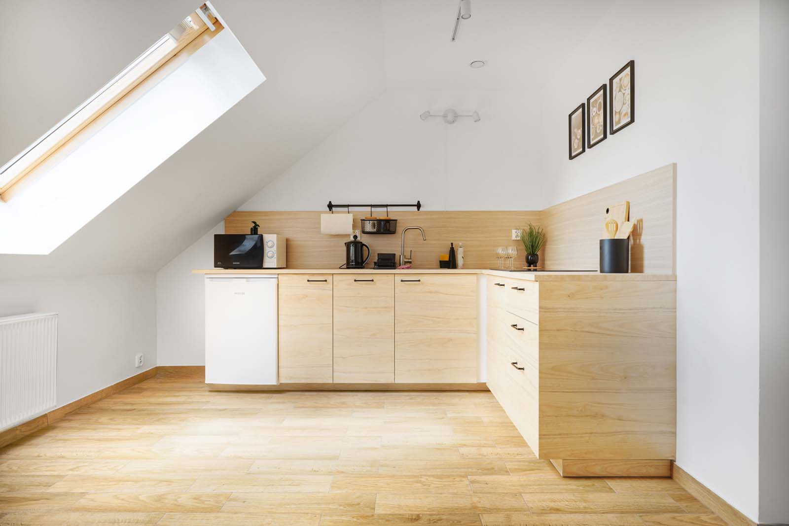 W pełni wyposażony aneks kuchenny: mikrofalówka, płyta indukcyjna, lodówka, czajnik, zmywarka, szklanki, sztućce itd.